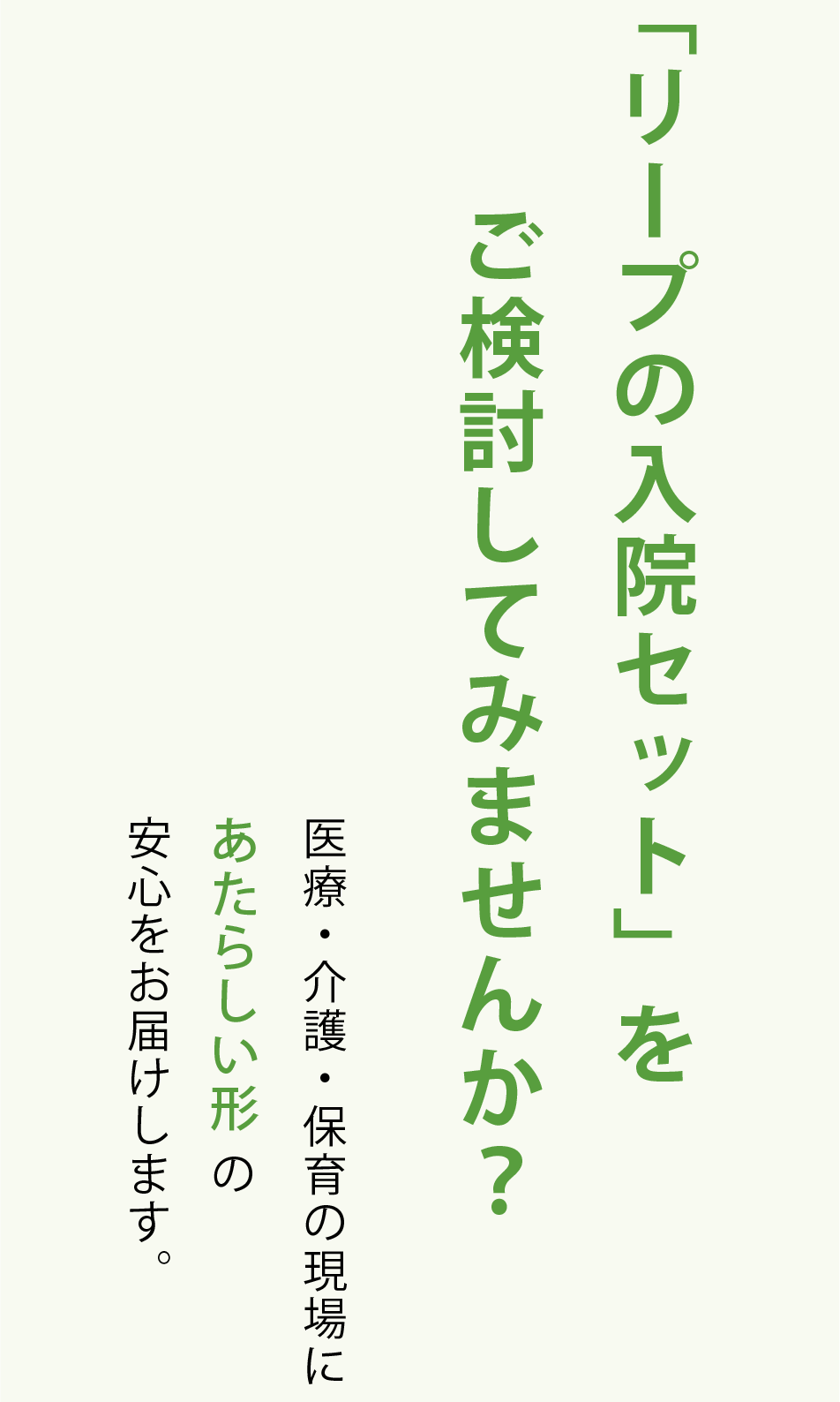 入院・入所セットを通じて、医療・介護に従事するスタッフ様や患者様、そのご家族様に寄り添い、皆様に満足していただける「あたらしい形」を皆様とともにつくりあげます。